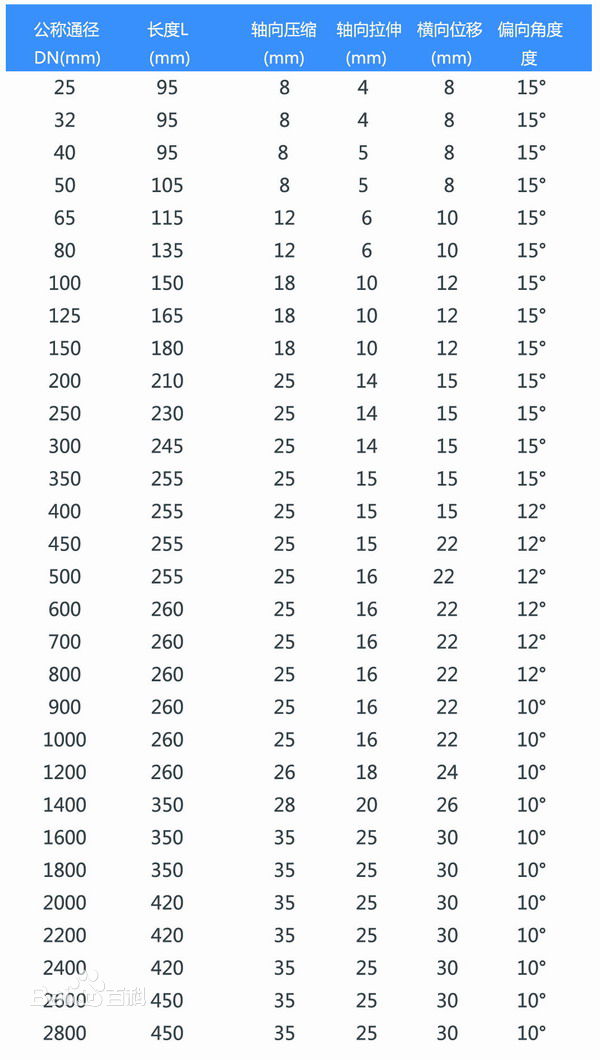 5、当管道位移量大于等于接头的最大补偿量时,应增加接头的数量来平行位移量,严禁为了调整管道的超差,使接头处于极限的挠曲位移和偏差状态,更不能超限度(伸缩、位移、偏转等),使用具体安装数据见下表。